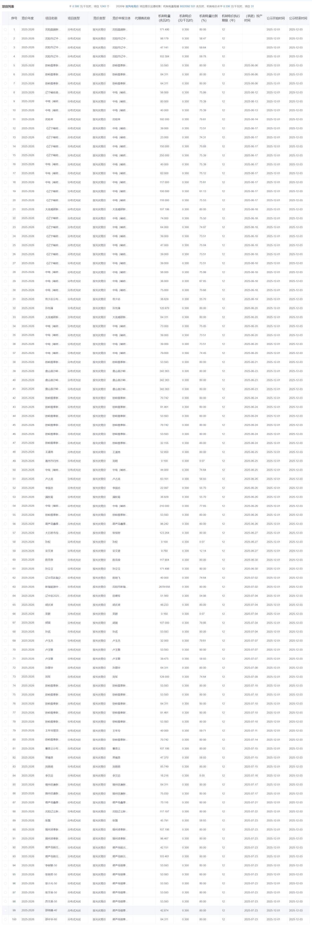 根据公示,2026年风电机制电量规模8022092.531兆瓦时,机制电价水平 0.330元/千瓦时,项目31个。2026年光伏机制电量规模142818.117 兆瓦时,机制电价水平0.300元/千瓦时,项目1243个。